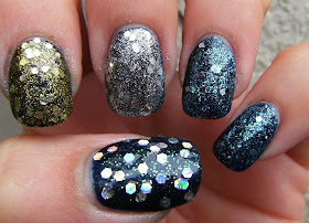 On my pinky and Ring finger is a franken i made by mixing Claire's Chunky Gold, Claire's Chunky Silver, Love My Nails Crystal and a little Claire's Matte Cobalt. I also added about 1/4 teaspoon of a teal dollar store glitter.