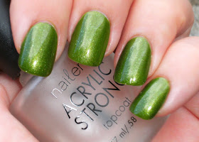 I know I said I would be layering NYC Love Letters over a green polish for my next post, but I think that this is very nice on it's own and I just couldn't top it with anything. Sinful Colors See You Soon is a lovely grass green with golden yellow-ish shimmer and sparse glass flecks. Here is a much better description of this shade.