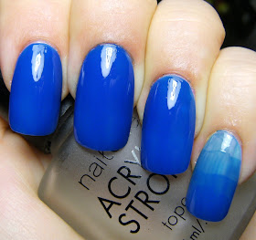 Billie Blue; I have made some beautiful, beautiful frankens with this jelly-ish bright primary blue. Although it took 4 coats to get to this opacity, there is still some areas that are a little sparse. This dried to a matte finish and I had to use 2 coats of Nailene Acrylic Strong Top Coat to get it to shine..... 2 coats! most of the polish's I wear I only use 1 coat of TC - and this just sucked it all up - weird.
