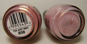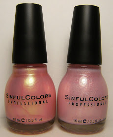 on the left; Sinful Colors Just You Wait, which I have worn HERE, and the mystery Sinful Color - I swear this had a label when I bought it. It is a shimmery glass fleck pink. I'll have to swatch it soon to figure out it's real name.