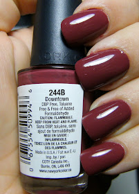 Any polish that is opaque in less than 3 thin coats and dry's fast is fabulous to me; BUT I have to apologize for my lack of accurate colour descriptions for these two polish's. MoMA is a bright but sheer Barbie Pink, while Down Town is a nice mulberry colour. Steph of Steph's Closet wrote " Downtown 244B - a dusty pomegranate pink creme." So I'm going with that