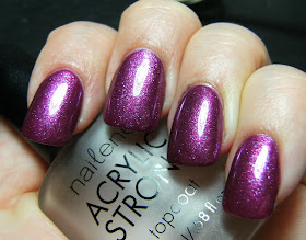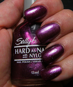 Middle nail ( second from top ) is 1 coat of Maybelline Violet Aluminum, the rest of my nails have 2 coats of Sally Hansen Grape Pop layered over 1 coat of Violet Aluminum.
