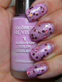 Here is a girly Mani. The base is a light pink pastel franken called Faith that I made a few months ago, followed by a coat of Wet n Wild Sparked that I added more pink loose glitter to. I fished out the large holographic hexagons from the Love my Nails Polish and placed them on my nails, then followed that with a coat of the actual love my nails polish to smoothe it out before Top Coat.