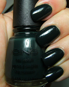 I am trying to wear some polish's that have been living in the back of my Deez-elmer..... China Glaze Watermelon Rind is a lovely dark green jelly with silver and some blue glass flecks. This needs 3 coats or more to be opaque, so I layered it over Icing Manic Monday, a dark green that is usually opaque in 2 coats.