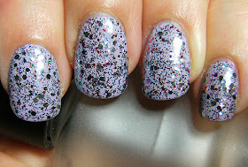1 coat of Sally Hansen Lacey Lilac with un-named ( but awesome ) Icing polish's and Wet n Wild Party of Five Glitters. I love Lacey Lilac, it is the perfect pastel purple creme - and I can usually use just one coat for perfect coverage. I added 1 coat of a multi-colored Icing polish, then one coat of a lovely blue and silver glitter, then 2 coats of the WnW Party of Five Glitters.