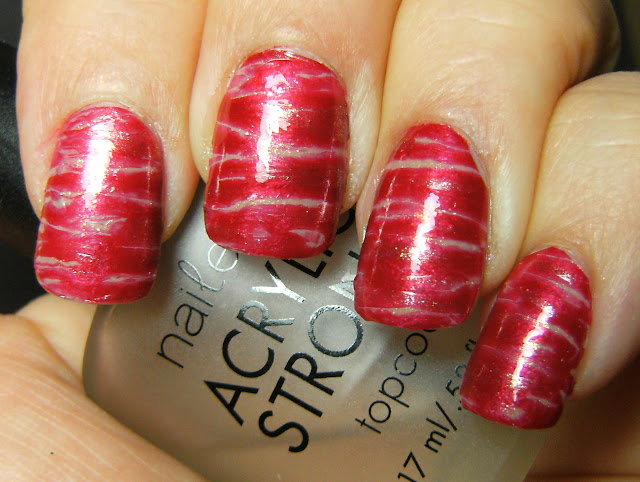 I cut up a plastic zip-lock bag and used a marker to create a template the width of my nail. I applied a generous amount of clear polish, then a red shimmery polish and used a rounded dotting tool to swirl the polish around on the plastic. I let it dry overnight then stored it in another zip lock bag. When I was ready to do my nails I gently lifted the dry nail sheet off the plastic and snipped off a small section, applied it to tacky-ish base polish, gently pressed it onto my nails and sealed it with TC. Alot of the wrinkles dissappeared after TC.
