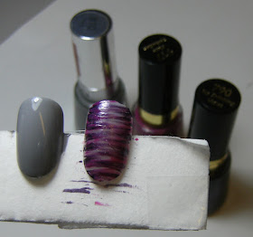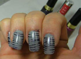 For this Mani I started with a base of Revlon Hazy, a grey creme, then used the fan brush to make these interesting whispy stripes. Some people are getting super duper thin whispy stripes and they look amazing - I'll be striving for that next time I try this.