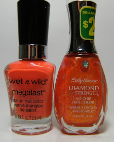 here is a quickie dupe check --- I thought for sure these two were the same colour; but WnW Club Havana is way more coral.... This is Sally Hansen Insta Dri Orange Impulse on my ring nail - 2 coats.