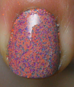 For some reason I didn't take an actual, whole 5 nail manicure photo ---- how did i pull that off? I guess I was excited about these neat matte neon glitters that I found at The Dollar Tree. Instead of mixing these into a clear base, I opted to do a glitter sprinkle.  The ratio of glitter here is 3 parts orange, 1 part purple and 1 part blue.