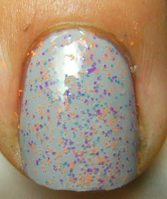 I started with a base of Claire's Matte Grey, when it dried I applied a coat of Pro FX Top Coat, then stuck a fluffy brush into my glitter mix and sprinkled it onto my nail. I applied a coat of TC to seal it all in. I wanted to see what I kind of glitter density I could achieve, so I went buck wild and sprinkled on copious amounts of matte neon glitter to my pinky and ring nail.