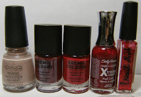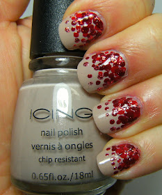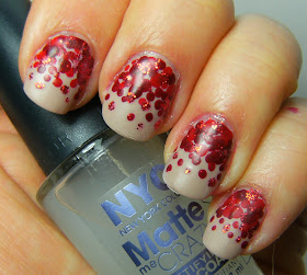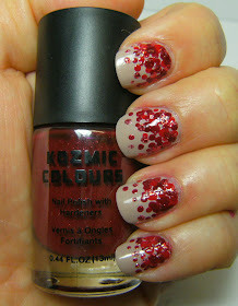 wow ---that Witchcraft red glitter is something else..... it really glows! This mani is a base of Icing Sandy Beach, multi-sized dots made with Kozmic Colours reds, Sally Hansen Red Comet, and Witchcraft Red Glitter. I used a matte Top Coat from N.Y.C. The bland base polish really made this dotti-cure extra special.