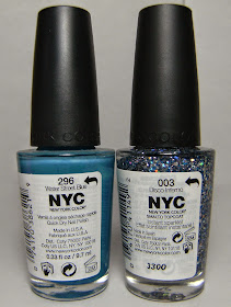 Wow---- this surprised me! I didn't think I would get this much glitter coverage out of one coat of N.Y.C. Disco Inferno. This is a multi-sized dark blue and silver glitter top coat. It was easy to apply and dried fast. I layered 1 coat of Disco Inferno over 2 coats N.Y.C. Water Street Blue.