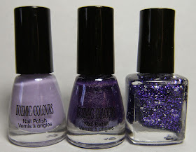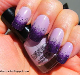 I love this creamy pastel purple colour! Today's mani is 2 coats of a lovely light purple Kozmic Colours polish. I sponged on a rich metallic dark purple to the tips of my nails, then lightly brushed a coat of dark purple and silver glitter to the tips of my nails.
